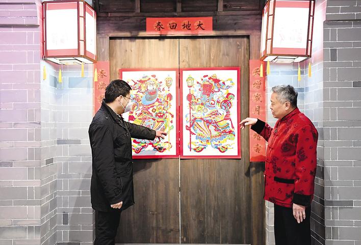 马习钦(右)向游客介绍武强木版年画《大戳锤门神》。