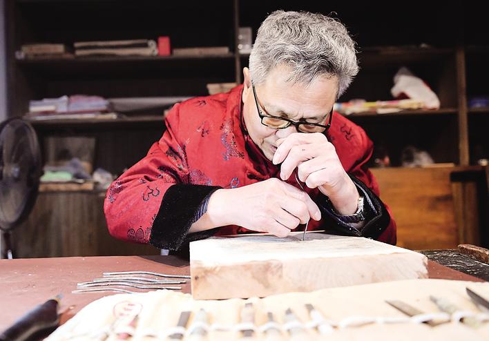 马习钦在雕刻武强木版年画。 苏小立 摄