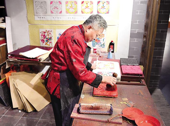 马习钦在印制武强木版年画。