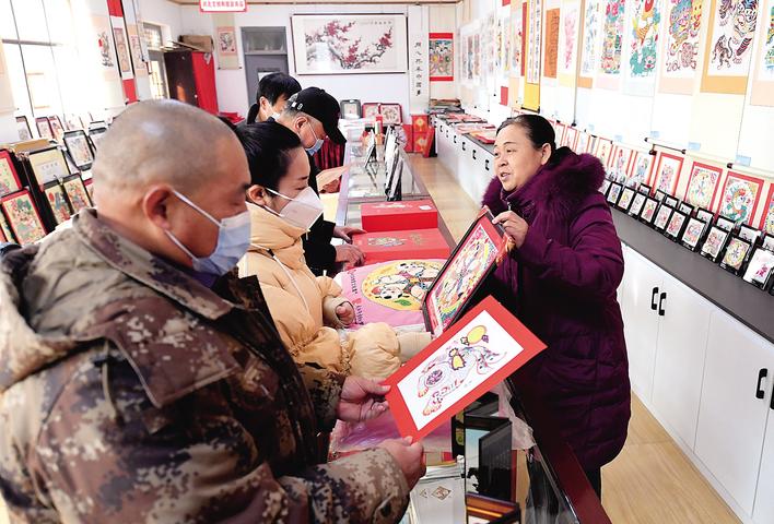顾客在武强县的一家年画商店选购年画。