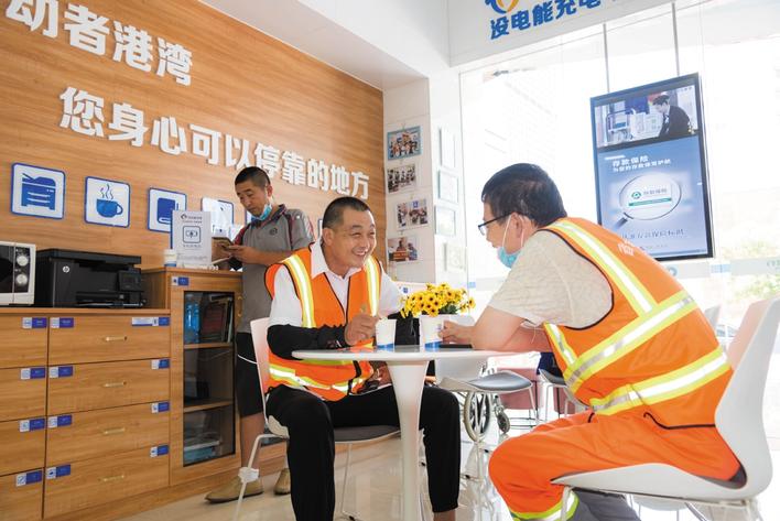 环卫工人在建行石家庄分行“劳动者港湾”休息避暑。