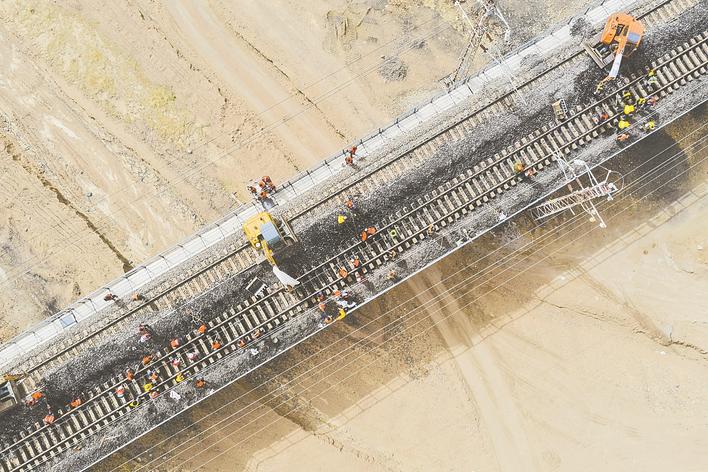 4月11日,中国铁路太原局集团有限公司大同工务段工人在大秦线27号桥进行施工作业,为迎峰度夏电煤保供夯实安全基础。新华社发