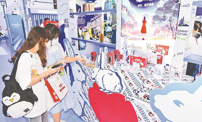 观众在消博会上挑选大白兔奶糖。