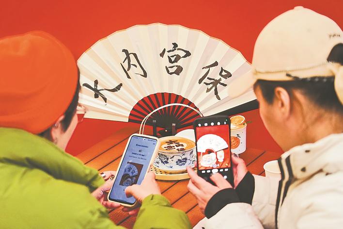 在位于北京大栅栏的内联升“大内·宫保”咖啡厅,顾客在拍摄一款网红咖啡。