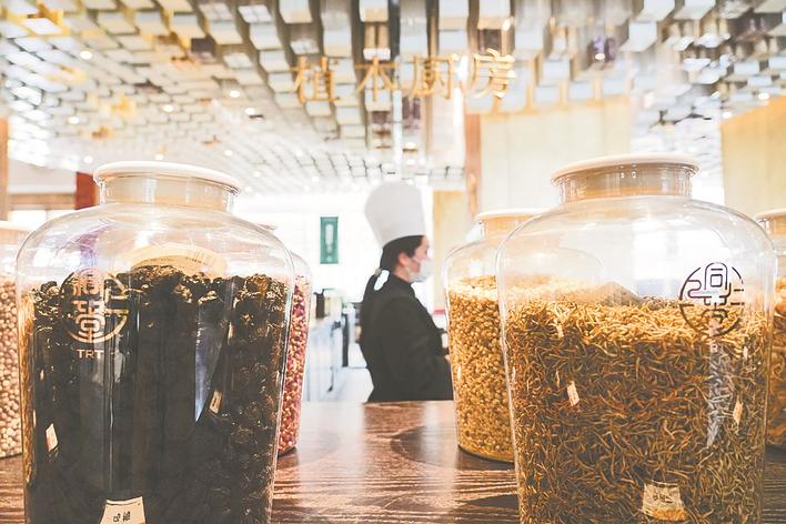 一些草本食材摆放在北京大兴区的同仁堂知嘛健康零号店餐厅内。