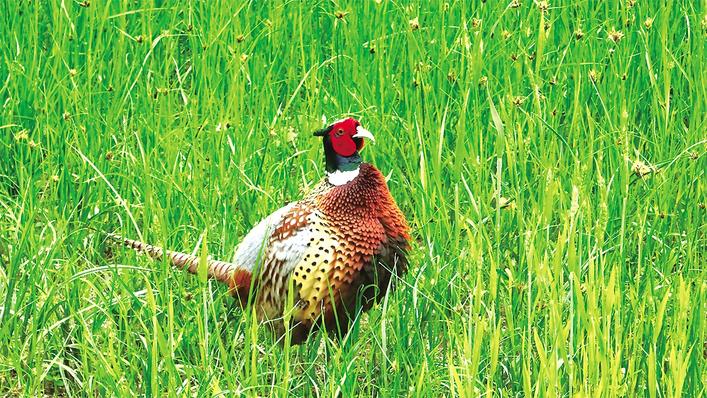 进入繁殖季的雄性环颈雉换上了美丽的羽毛,头上长出了角羽,它漫步在灌丛杂草间,时而扇动着翅膀,打鸣叫唤,来显示势力范围和领地,时而陪伴在雌鸟旁,抖动着艳丽的羽毛炫耀自己。
