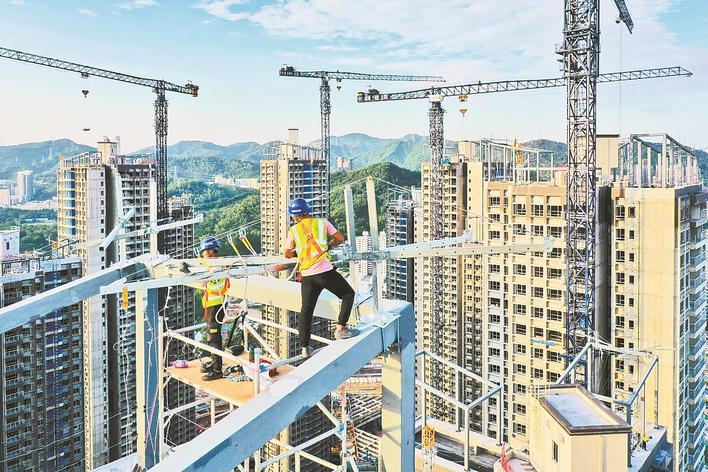 工人在深圳“棚改第一村”华富村回迁安置房楼顶进行幕墙装配作业。