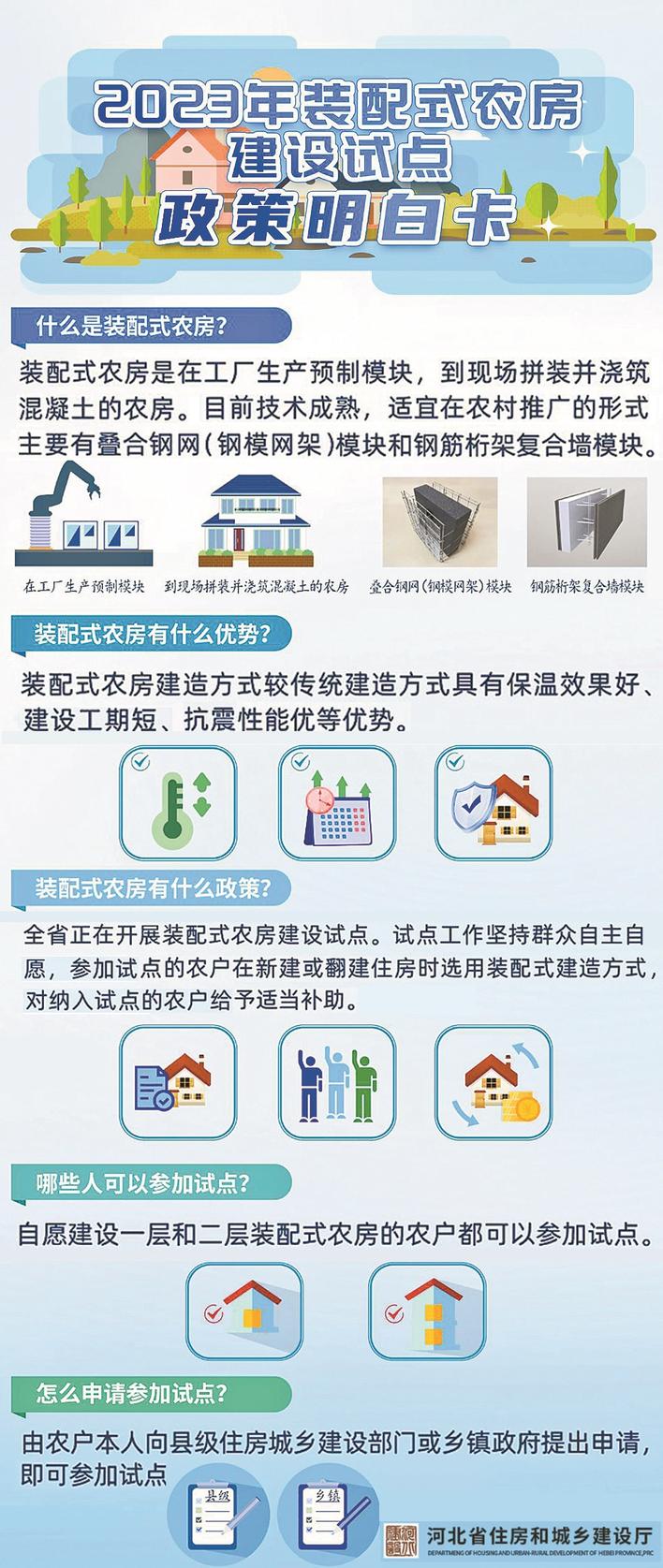 河北省2022年启动装配式农村住房建设试点工作,由农民作为建房主体,有面向农村地区装配式产品的企业自愿参加,每年建成一批性能优良、样式美观、色彩协调、功能完善、工期优势明显的装配式农村住房。省住房和城乡建设厅根据企业报名情况和现场调研结果,每年公布参与企业名单和产品目录,方便群众选用。截至目前,河北省已公布装配式农村住房建设技术产品目录两批,涉及企业72家。按照省住房和城乡建设厅印发的《河北省农村安全清洁居住场景建设行动方案》,今年,河北省将再建成500户适用、安全、节能、美观的装配式示范农房;到2025年,累计建成2000户以上装配式农村住房