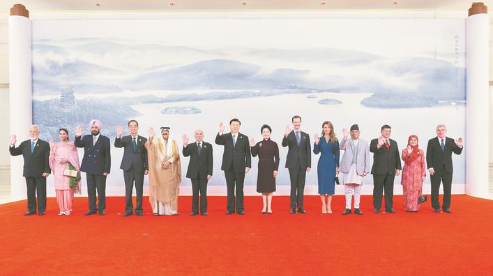 9月23日中午,国家主席习近平和夫人彭丽媛在浙江省杭州市西子宾馆举行宴会,欢迎来华出席杭州第19届亚洲运动会开幕式的国际贵宾。这是习近平和彭丽媛同贵宾们合影留念。 新华社记者 黄敬文 摄