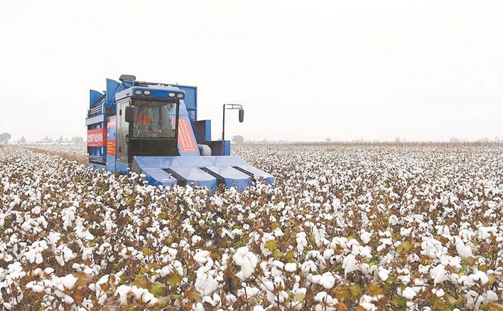 采棉机在丰收的棉田里作业。 河北省农林科学院 供图