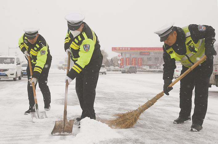 沧州市公安交警支队二大队各中队执勤交警在维护交通秩序的同时,清扫路口积雪。通讯员 孙明山 摄