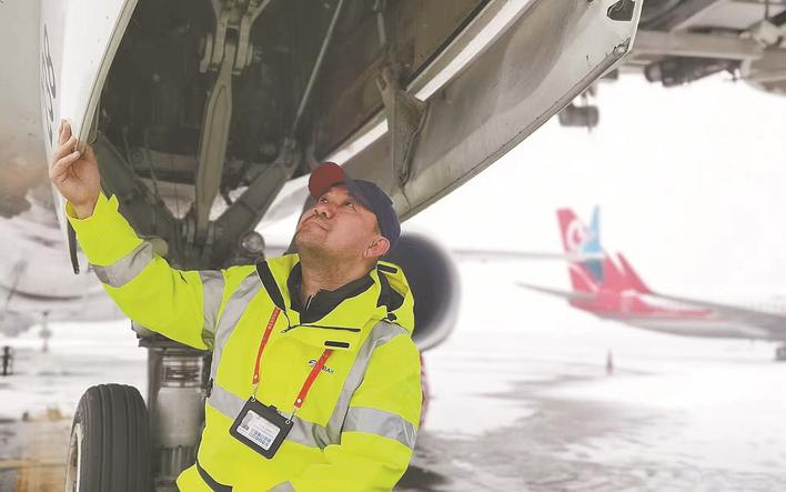 石家庄机场工作人员在对机身进行检查,确保航空器进出机位安全顺畅。