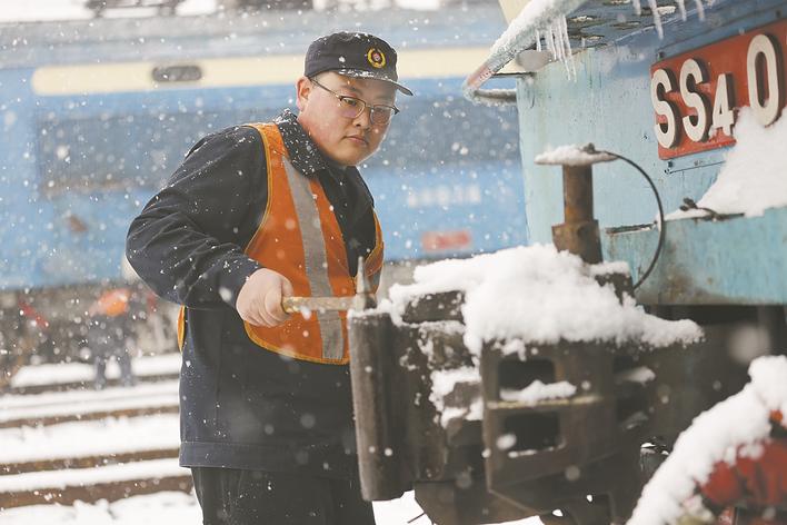中铁北京局集团有限公司石家庄电力机务段配齐整备场道岔(电动)除雪人员,保证各所辖道岔清洁。通讯员 王勇 杨波 摄
