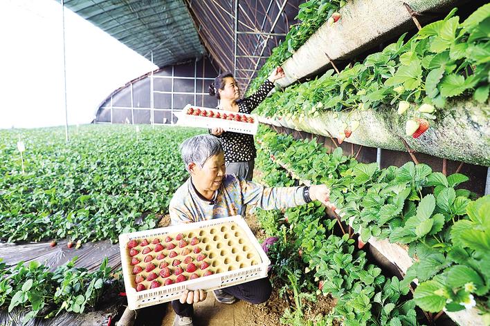 平泉市认真实施乡村振兴战略,通过产业结构调整,加大科技培训力度,大力发展食用菌、设施菜、林果种植产业,促进了产业发展和农民致富增收。图为平泉市平泉镇农业基地的农民正在温室棚内采摘草莓。李平文 摄