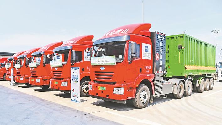 在河钢唐钢新区,首批投放的30辆49吨氢能重卡整装待发。 赵辉 摄