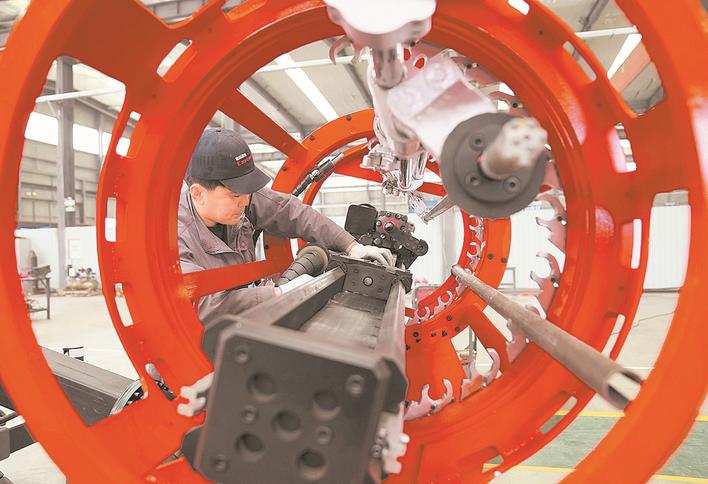 4月2日,工人在昌黎县一家工程机械设备企业的生产车间工作。