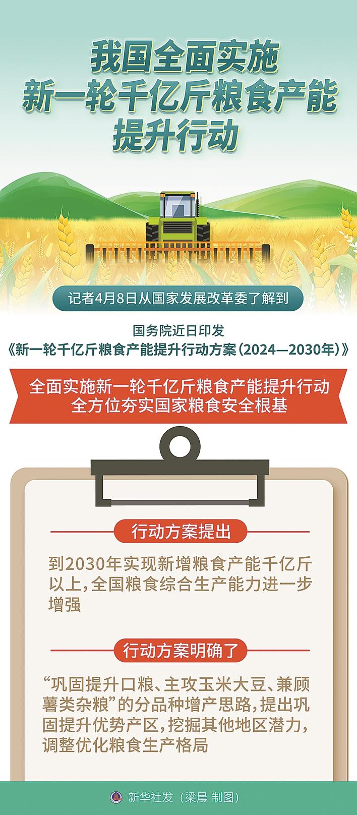 记者从国家发展改革委了解到,国务院近日印发《新一轮千亿斤粮食产能提升行动方案(2024—2030年)》。行动方案出台的背景是什么?如何确保完成新增千亿斤粮食产能目标?新华社记者采访了国家发展改革委负责人。