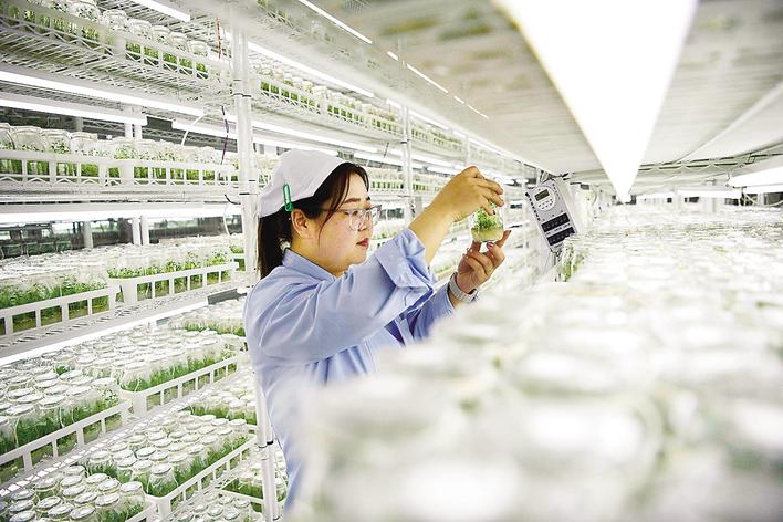 近期,“马铃薯之乡”围场满族蒙古族自治县进入马铃薯脱毒薯苗扩繁旺季,农技人员加强马铃薯脱毒薯苗的日常管护,确保种薯丰产。图为农技人员在观察马铃薯脱毒薯苗生长情况。王立群 摄