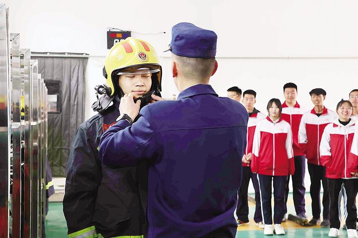 近日,隆化县职教中心高三年级70余名师生应邀走进隆化县应急消防科普教育基地,开展消防安全体验活动,提升了师生们的消防安全意识和自防自救能力。图为工作人员带领学生试穿防护装备。 张骁 摄