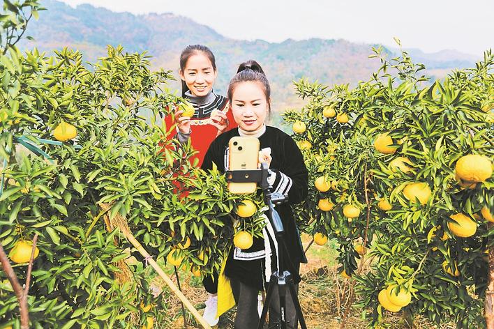 在贵州省榕江县忠诚镇干烈村黄金柚基地,主播通过线上方式销售黄金柚。