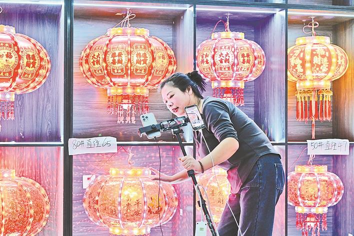 村民在石家庄市藁城区屯头村电商直播基地销售宫灯。