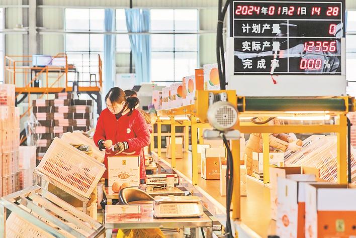 工人在湖北省秭归县一家电商产业园内包装脐橙。