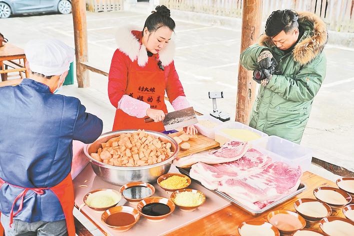 在陕西省安康市汉滨区,新农人李花(中)在她的农家乐院内,制作准备用于网络销售的蒸碗,并拍摄短视频。