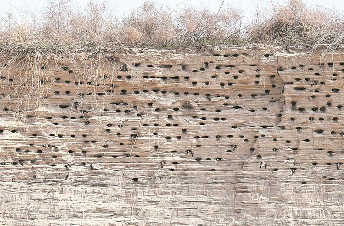 近日,在石家庄市正定县曲阳桥镇滹沱河大桥旁的沙土岛崖壁上,成群的崖沙燕飞来筑巢定居,密密麻麻的巢穴蔚为壮观。