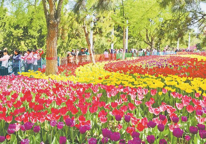 4月30日,游客在秦皇岛市海港区新世纪公园欣赏郁金香。