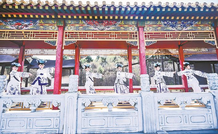 身着传统服饰的小朋友在石家庄市正定荣国府影视基地游览拍照。