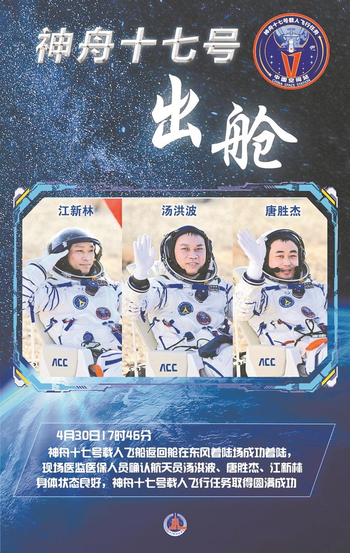 据新华社酒泉4月30日电(记者李国利 刘艺 黄一宸)4月30日17时46分,神舟十七号载人飞船返回舱在东风着陆场成功着陆,现场医监医保人员确认航天员汤洪波、唐胜杰、江新林身体状态良好,神舟十七号载人飞行任务取得圆满成功。