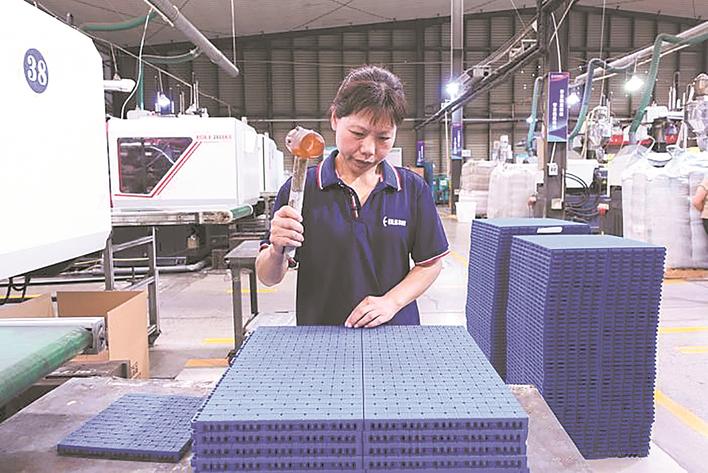在英利奥园区注塑车间内,工作人员正在对运动地板进行拼装整理。 本报记者 弓幸民 摄