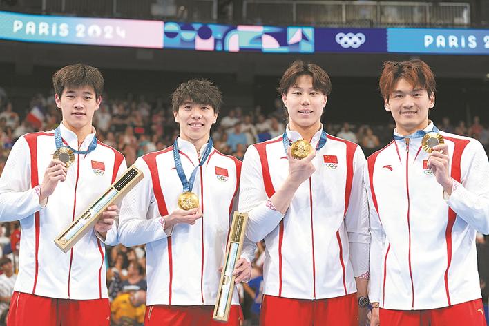 8月4日,冠军中国队选手徐嘉余、覃海洋、孙佳俊、潘展乐(从右至左)在颁奖仪式上。当日,在巴黎奥运会游泳项目男子4x100米混合泳接力决赛中,中国队以3分27秒46的成绩夺得金牌。新华社记者 杜宇 摄