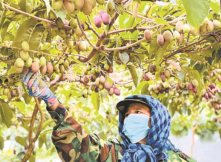 基地附近村民为红肉软枣猕猴桃进行疏果。