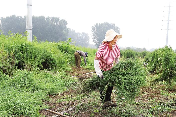 在香河县安平镇中草药种植基地,种植户在搬运成捆的荆芥。