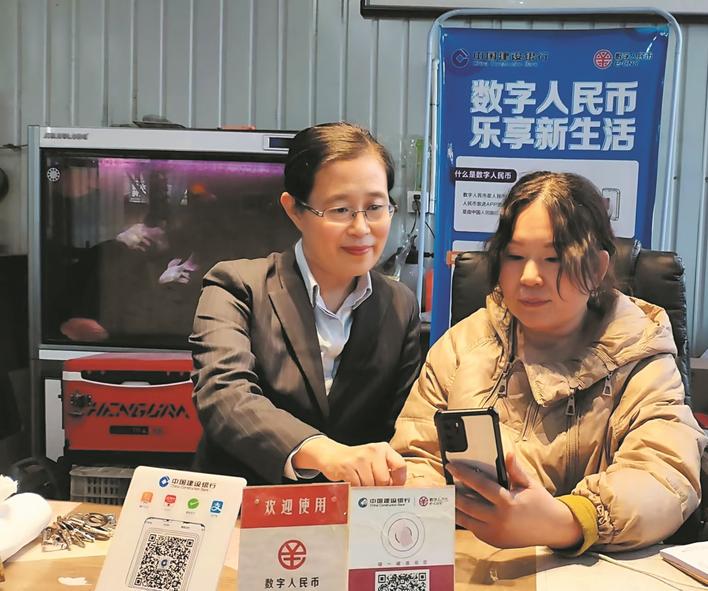 建行沧州盐山支行客户经理指导商户使用数币交易。