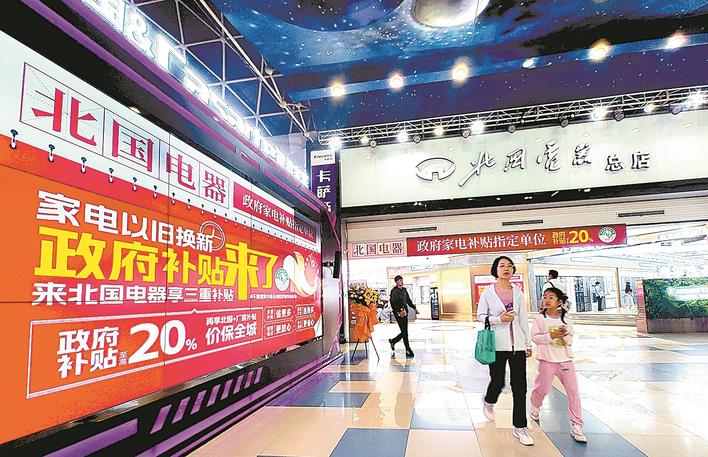 北国电器总店内的大屏幕显示家电以旧换新活动海报。本报记者 烟成群 摄