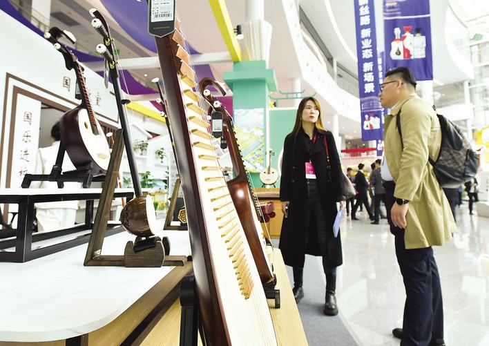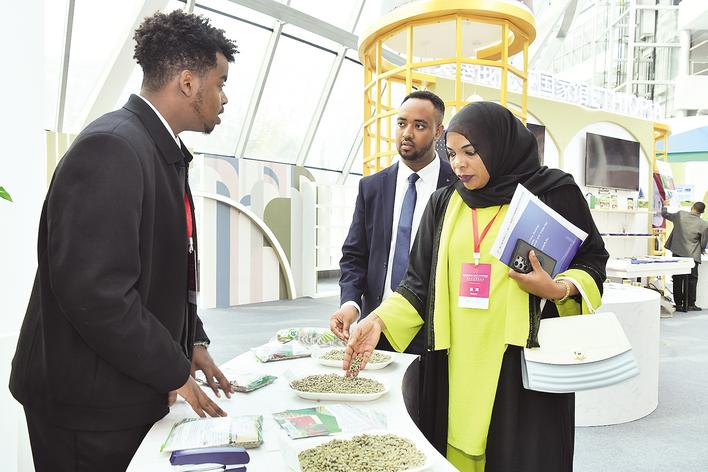 ◀埃塞俄比亚参展商(左)向客商介绍参展商品。
