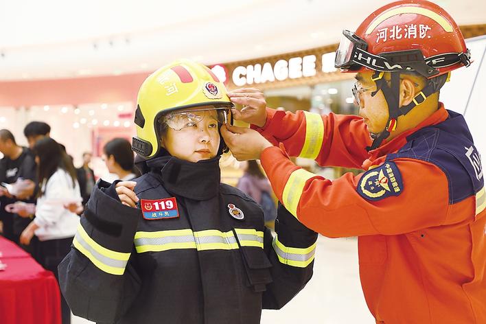 市民试穿消防救援服。