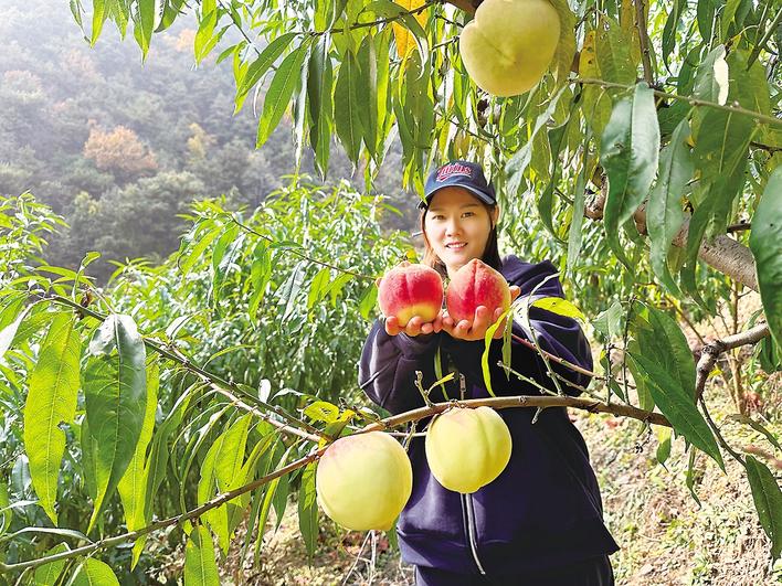深秋时节,迁西县尹庄乡瓦房峪村鲜桃采摘园迎来丰收,向阳的山坡上一棵棵桃树郁郁葱葱,鲜红饱满的桃子挂满枝头。近年来,迁西县充分利用当地山多地少、昼夜温差大、土壤肥沃、山泉水质佳的自然条件,积极引导农户发展桃、梨、葡萄等特色优质林果种植产业,促进农业增效,农民增收。图为游客在展示采摘的鲜桃。