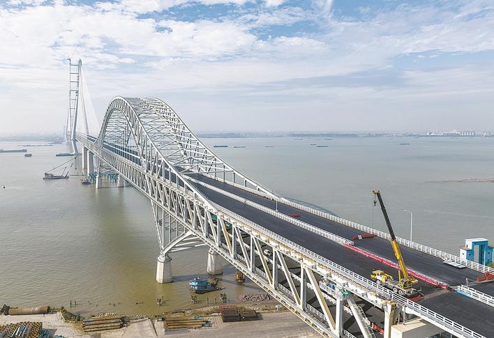 这是11月10日拍摄的建设中的常泰长江大桥。11月9日,经过近三个月的紧张施工,常泰长江大桥上下层钢桥面主体铺装全部完成。这是这座世界最大跨度斜拉桥全线贯通后,工程建设取得的又一次重大进展。常泰长江大桥连接江苏省常州、泰州两市,是长江上首座集高速公路、城际铁路、普通公路三种方式于一体的过江通道。据了解,常泰长江大桥预计2025年上半年基本建成。 新华社发(汤德宏 摄)