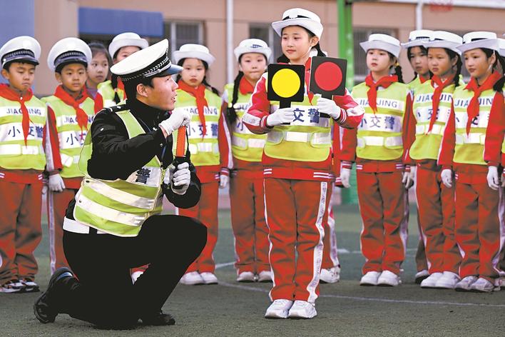 12月2日,在石家庄市四中路小学,交警给小朋友讲解交通安全知识。新华社发(陈其保 摄)