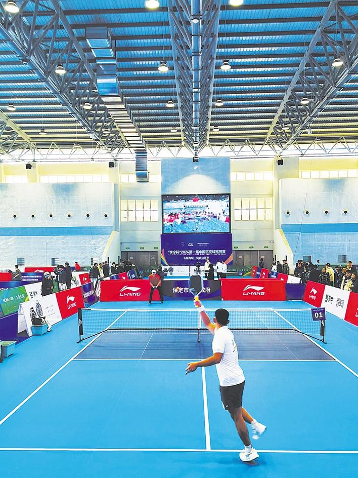 近日,2024第一届中国匹克球巡回赛保定公开赛激情开赛,这是落地保定的首个匹克球全国赛事。公开赛为期2天,比赛项目包括男子单打、女子单打、男子双打、女子双打、混合双打,来自全国的300多名选手展开竞技角逐。图为匹克球比赛现场。马晨辉 摄