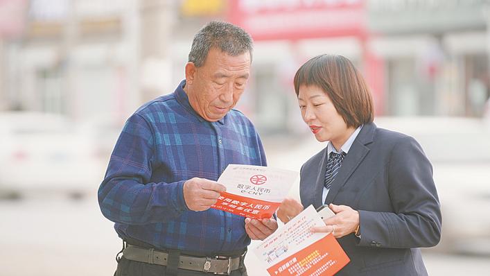 邮储银行河北雄安分行工作人员向老河头镇居民介绍数字人民币。