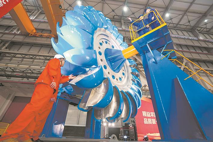 2024年12月30日,在哈电集团哈尔滨电机厂有限责任公司生产车间,工作人员在检查冲击式水轮机转轮焊接质量。 当日,世界首台单机500兆瓦扎拉水电站冲击式水轮发电机组转轮在哈电集团哈尔滨电机厂有限责任公司完成焊接制造,标志着我国高水头、大容量冲击式水电机组的研制技术实现了重大突破,走在了世界前列。该水轮机转轮是国家“藏电外送”骨干电站扎拉水电站水轮发电机组的“心脏”,为发电机发出500兆瓦额定功率提供源动力。哈电电机自主化研制的冲击式转轮能量转换效率达到世界先进水平,转轮采用锻焊结构,由1个轮毂锻件和21个水斗锻件组成,焊接后的重量超过90吨。新华社记者 王建威 摄