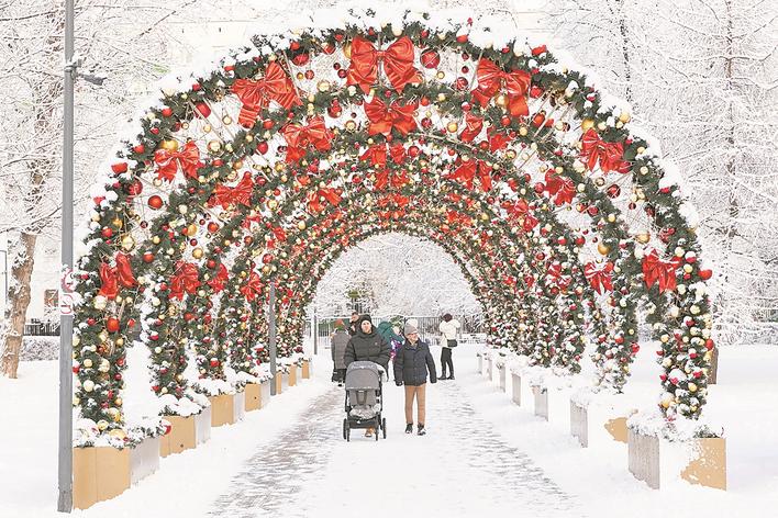 2024年12月31日,人们在俄罗斯首都莫斯科的新年装饰下漫步。 新华社记者 白雪骐 摄