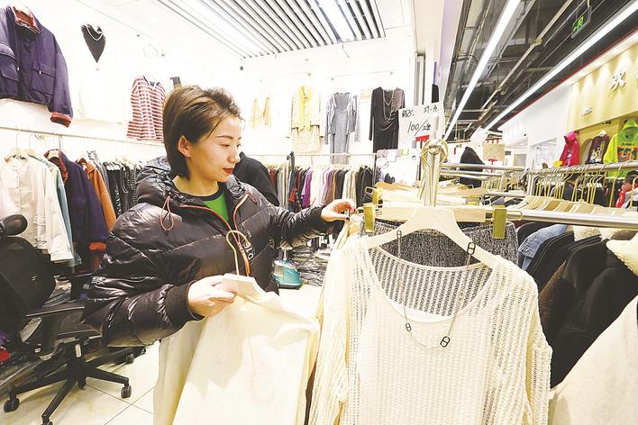 近日,走进位于永清县的云裳小镇云裳国际服装城,这里作为京津冀地区最大的创意时尚设计小镇,大部分商户已开门营业,尤其是一楼女装区吸引了众多顾客前来选购新衣。图为商户在打理服装。庞趁友 摄