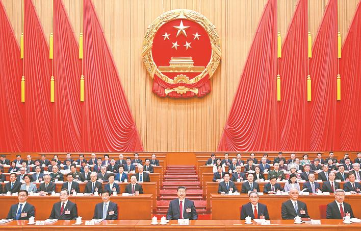 人民大会堂大礼堂气氛庄重热烈,主席台帷幕正中的国徽与会场穹顶上的五角星灯交相辉映。