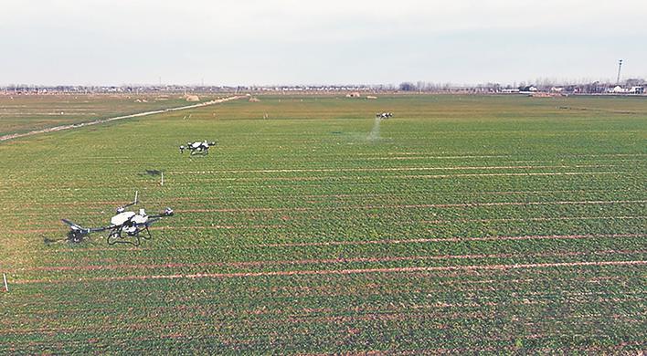 说话间,随着齐航熟练地按下遥控器上的启动按钮,无人机发出一阵低沉而有力的轰鸣声,缓缓腾空而起,像一只展翅翱翔的雄鹰,在麦田上方快速穿梭。下方的麦苗在农药均匀细密的喷洒下,嫩绿的叶片轻轻摆动,仿佛尽情享受科技带来的“滋养”。