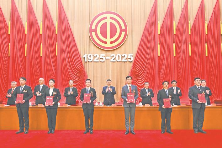 人民大会堂大礼堂气氛隆重热烈。主席台上方悬挂着“庆祝中华全国总工会成立100周年暨全国劳动模范和先进工作者表彰大会”会标,后幕正中悬挂中国工会会徽,会徽下方是“1925-2025”字标,10面红旗分列两侧。二楼眺台悬挂着标语:“以习近平新时代中国特色社会主义思想为指导,坚定不移听党话跟党走,在以中国式现代化全面推进强国建设、民族复兴伟业中充分发挥工人阶级主力军作用和工会桥梁纽带作用!”